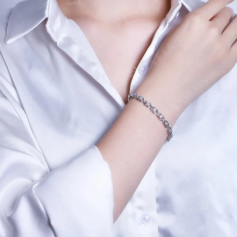 Each stone is precision-set to maximize brilliance and create a fluid, eye-catching line of shimmer around the wrist. The bracelet’s secure clasp and smooth finish ensure both comfort and durability, making it perfect for everyday glam or evening sophistication.